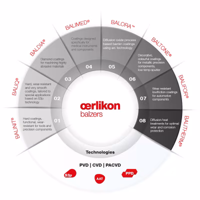The surface technologies offered by Oerlikon Balzers enhance the surfaces of tools and precision components and improve their behavior and performance compared to alternative surface treatment technologies.