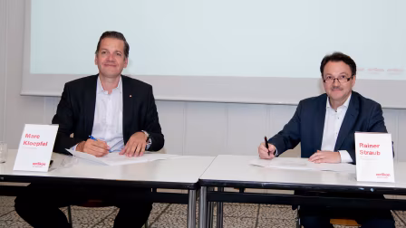Caption 2: Marc Kloepfel, CEO of the Kloepfel Group, and Rainer Straub, Managing Director of Oerlikon Nonwoven (right), signing the contract for the purchase of a new Oerlikon Nonwoven meltblown technology system.
